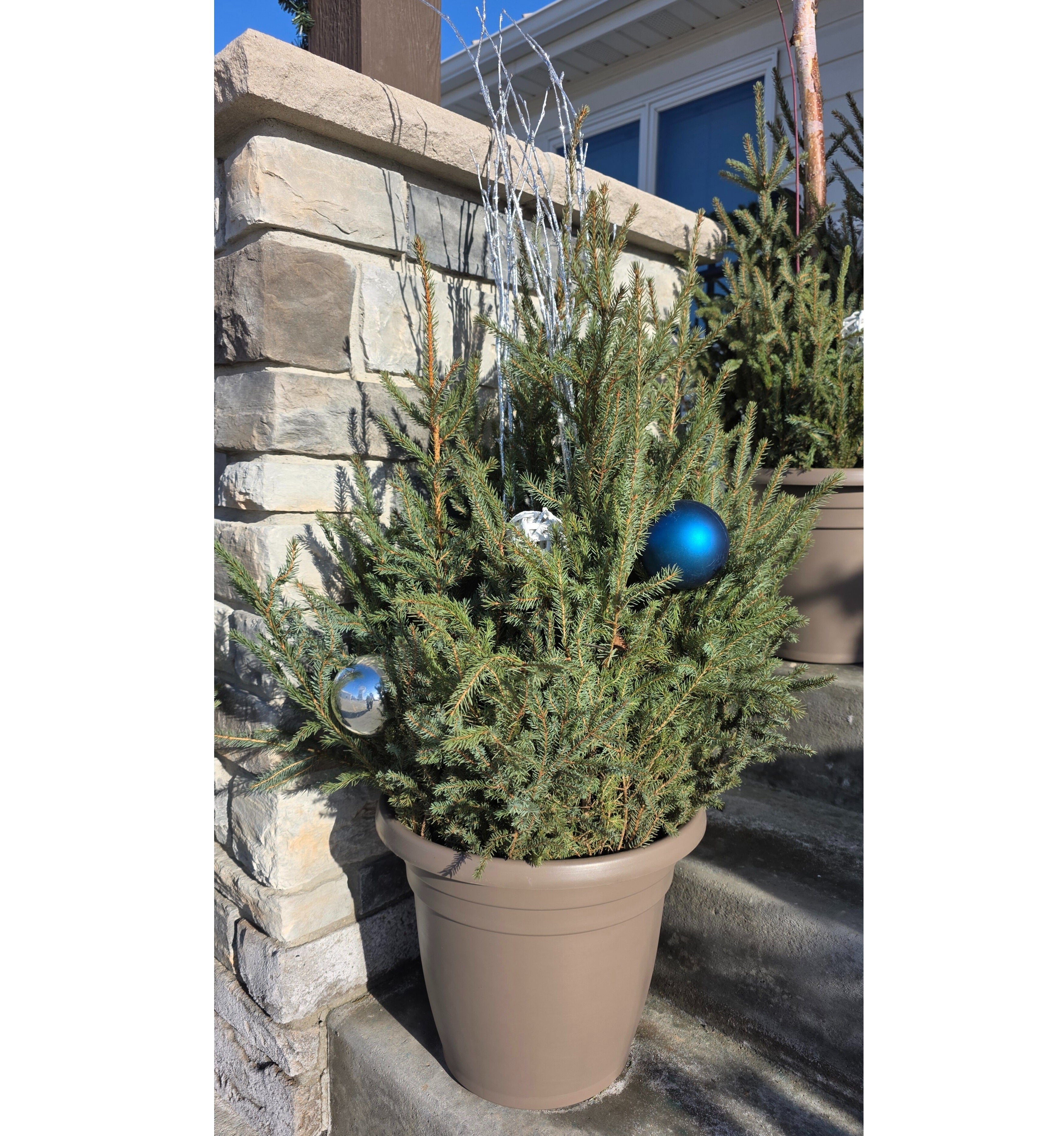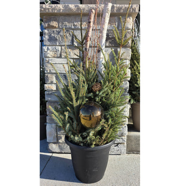 A ready-to-display container featuring fresh seasonal greens and decorative picks. Perfect for adding instant color and texture to porches, patios, and entryways. Designed to complement outdoor spaces during the quiet winter months.