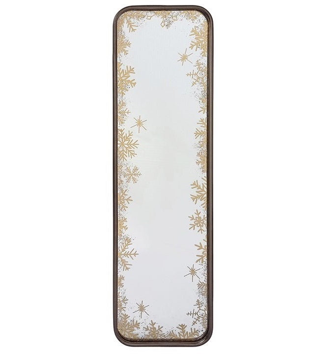 Bring a cozy touch of winter magic to your home with this rectangular wall mirror, framed in metal and adorned with a delicate snowflake border. It catches the light beautifully, adding a gentle sparkle that brightens any room. A simple, elegant way to reflect the warmth and charm of the season. Measures 36" x 10".