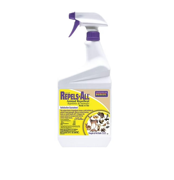 Bonide Repels-All Animal Repellent is a natural, effective solution for keeping pests away from gardens, lawns, flowerbeds, and other desirable plants. Made from biodegradable ingredients that are irritants to animals but safe for people and pets, it repels a wide range of species including squirrels, deer, rabbits, chipmunks, mice, skunks, raccoons, porcupines, birds, groundhogs, and more. Perfect for use around homes, gardens, garbage cans, barns, patios, decks, woodpiles, swimming pools, and campsites. Comes in a convenient ready-to-use spray bottle for easy application directly on leaves, stems, branches, bulbs, seeds, or hard surfaces.