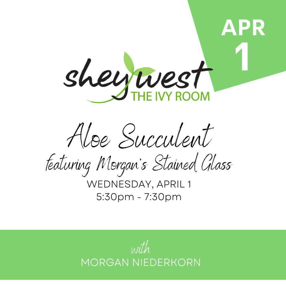 Come get crafty at SheyWest in our beautiful event space, The Ivy Room! Morgan of Morgan's Stained Glass will teach you how to create a stained glass aloe that will add a touch of handmade love to your home.