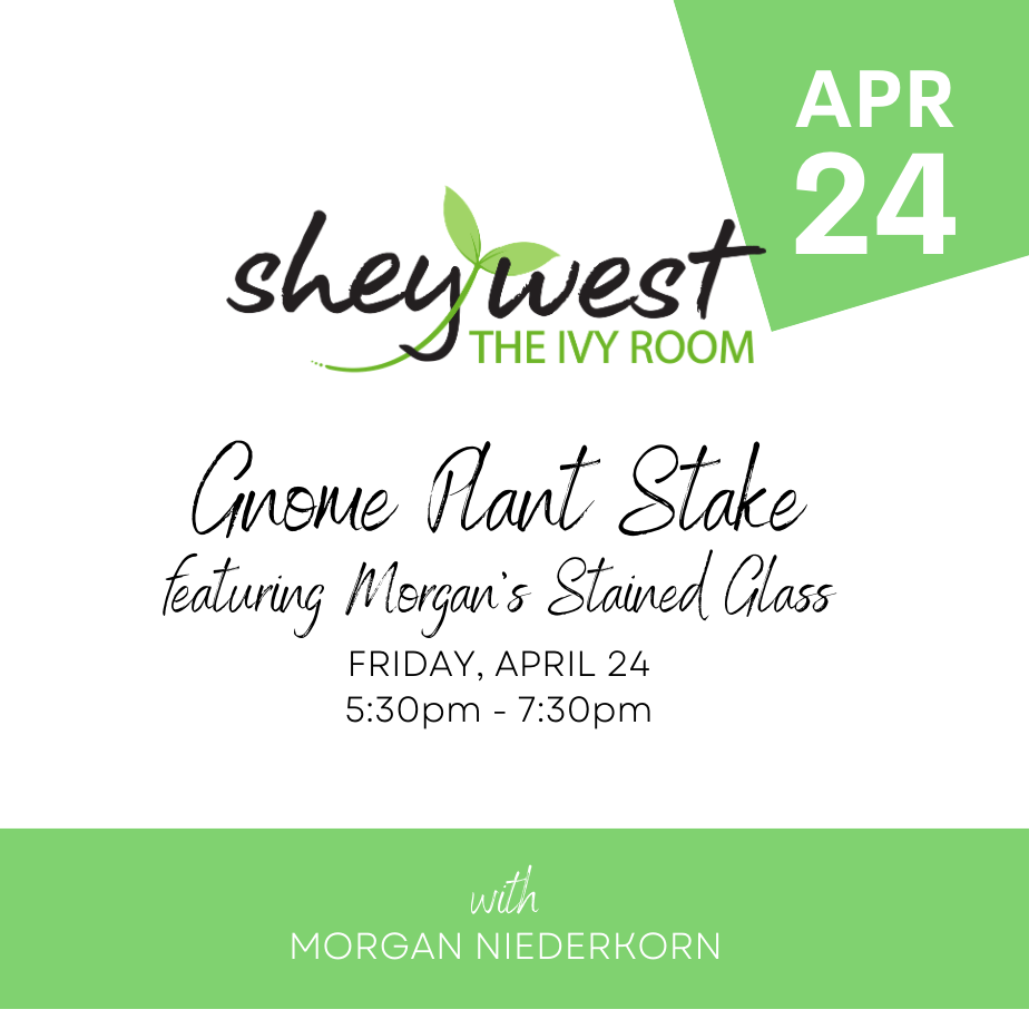 Come get crafty at SheyWest in our beautiful event space, The Ivy Room! Morgan of Morgan's Stained Glass will teach you how to create a stained glass gnome plant stake that will add a touch of handmade love to your home.