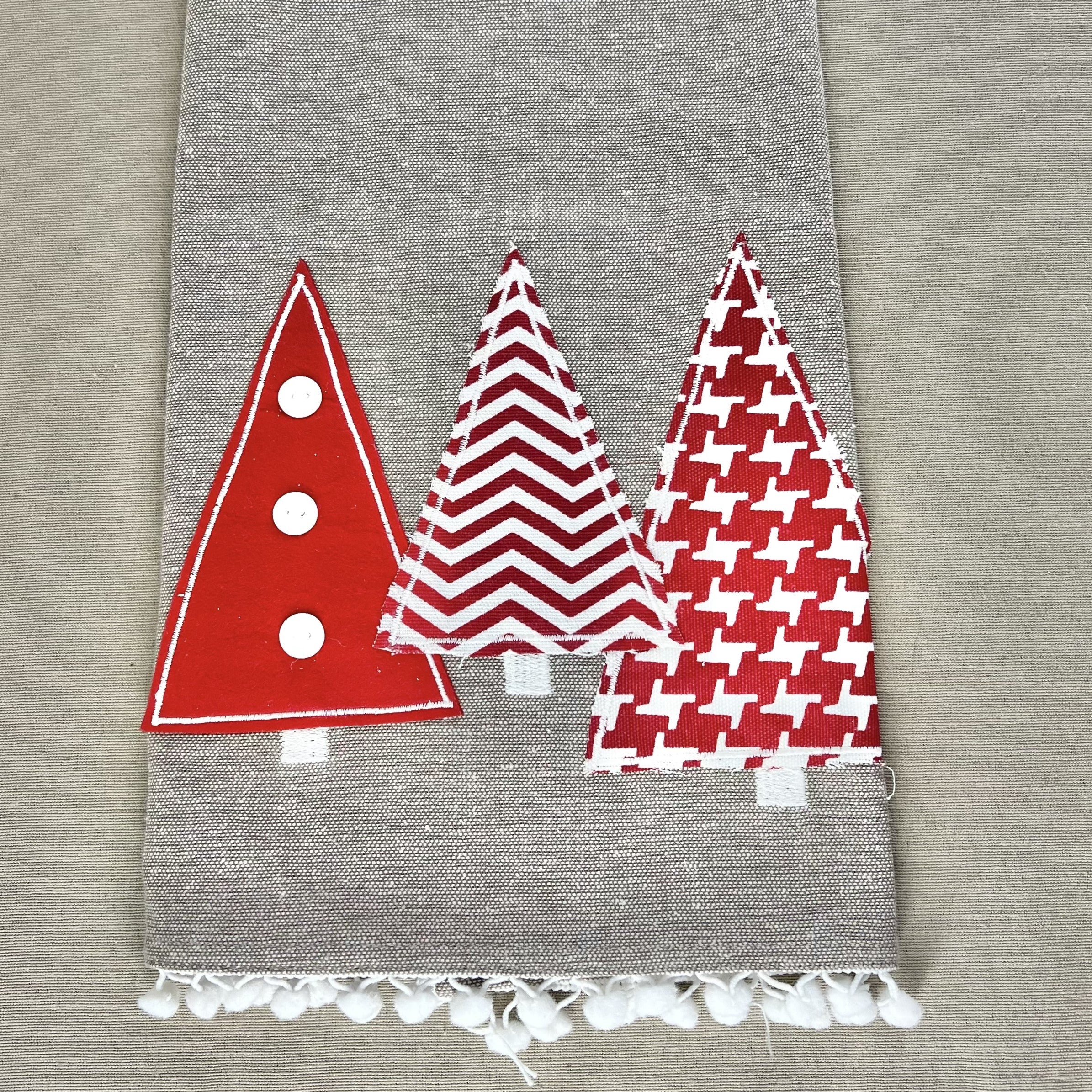 28 Inch Gray Cotton Towel w/Red Christmas Trees & Pom Pom Trim