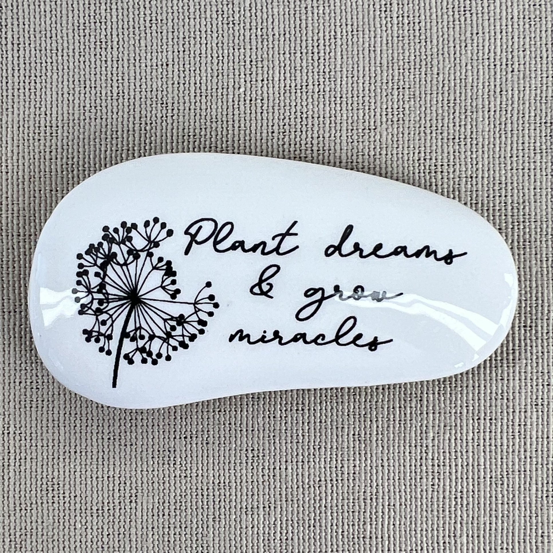 ceramic black & white dandelion token with Plant Dreams & Grow Miracles saying