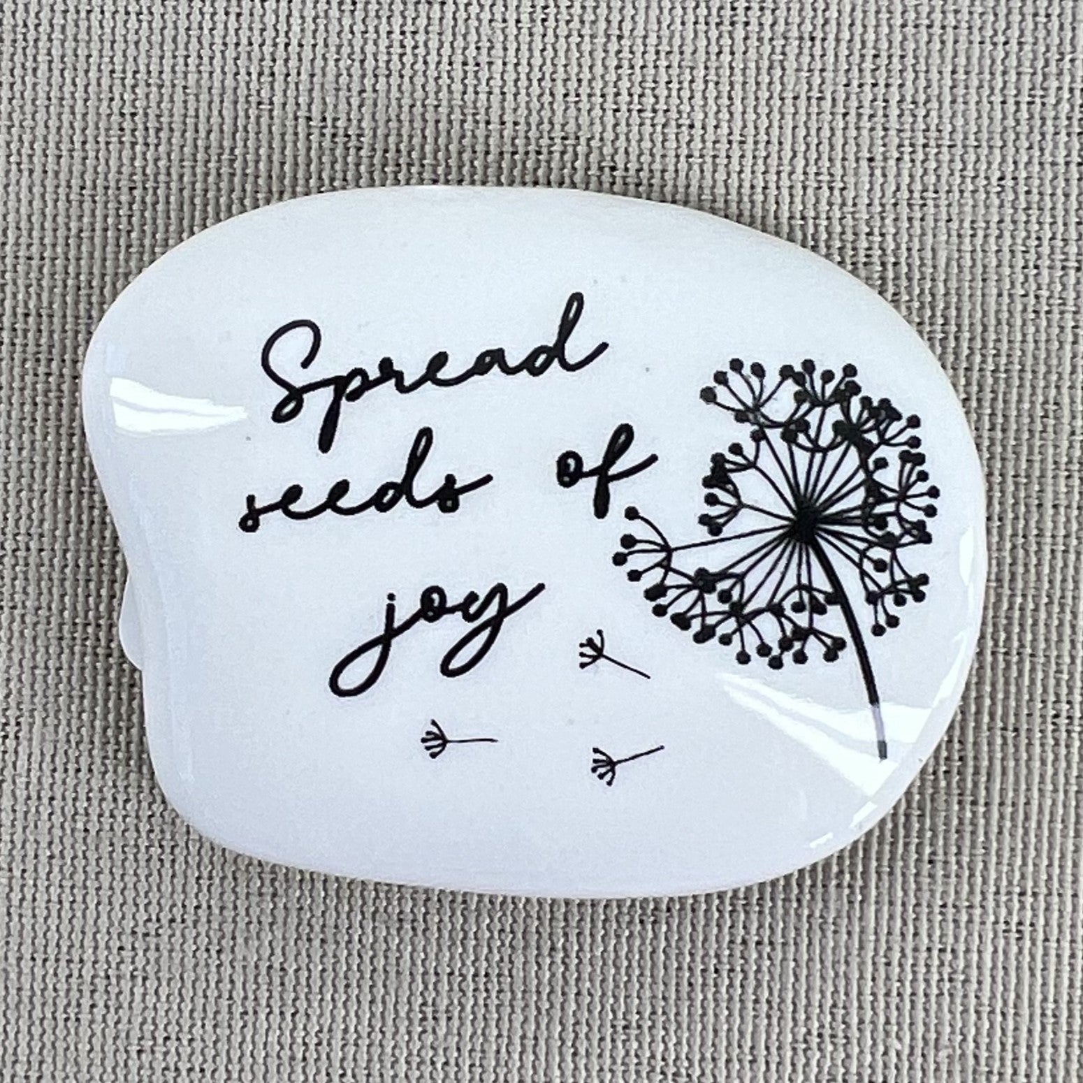 ceramic black & white dandelion token with Spread Seeds of Joy saying