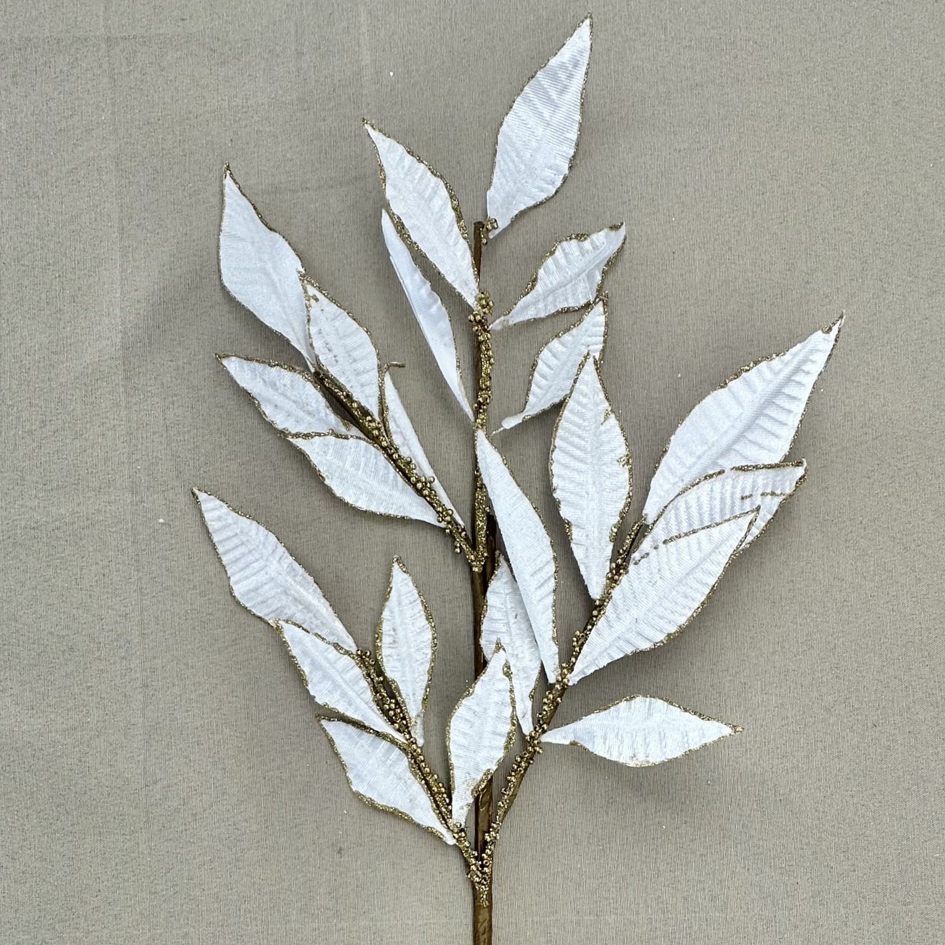 32 Inch White Velvet Leaf Stem w/Gold Trim