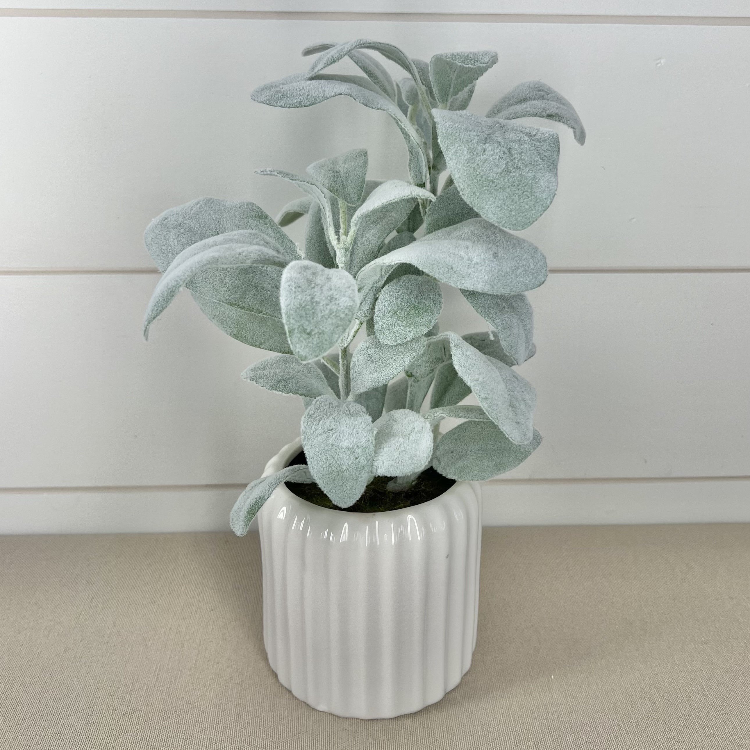 11 Inch Lambs Ear in White Ribbed Ceramic Pot