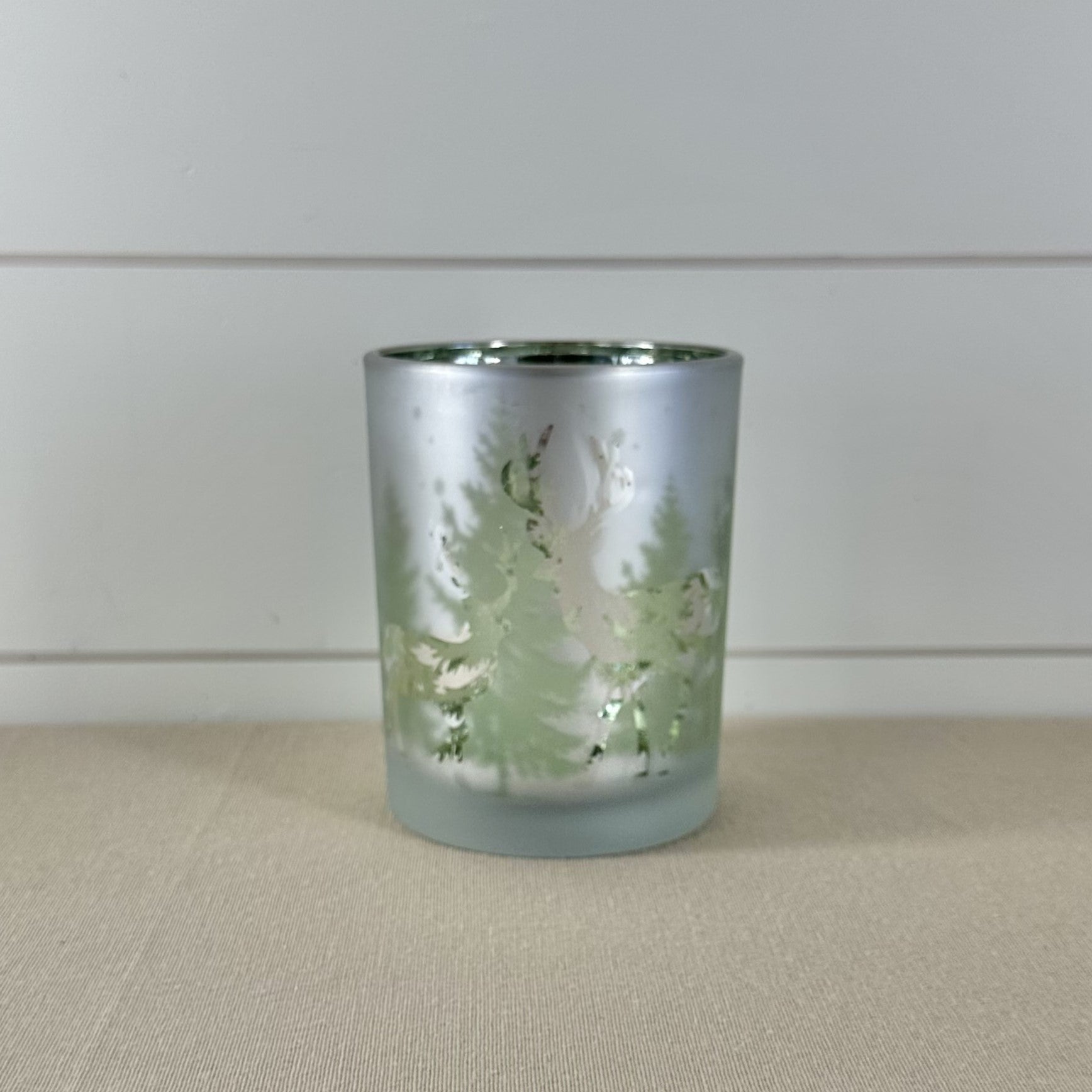 Frosted Glass w/Green Interior Deer Winter Scene Votive
