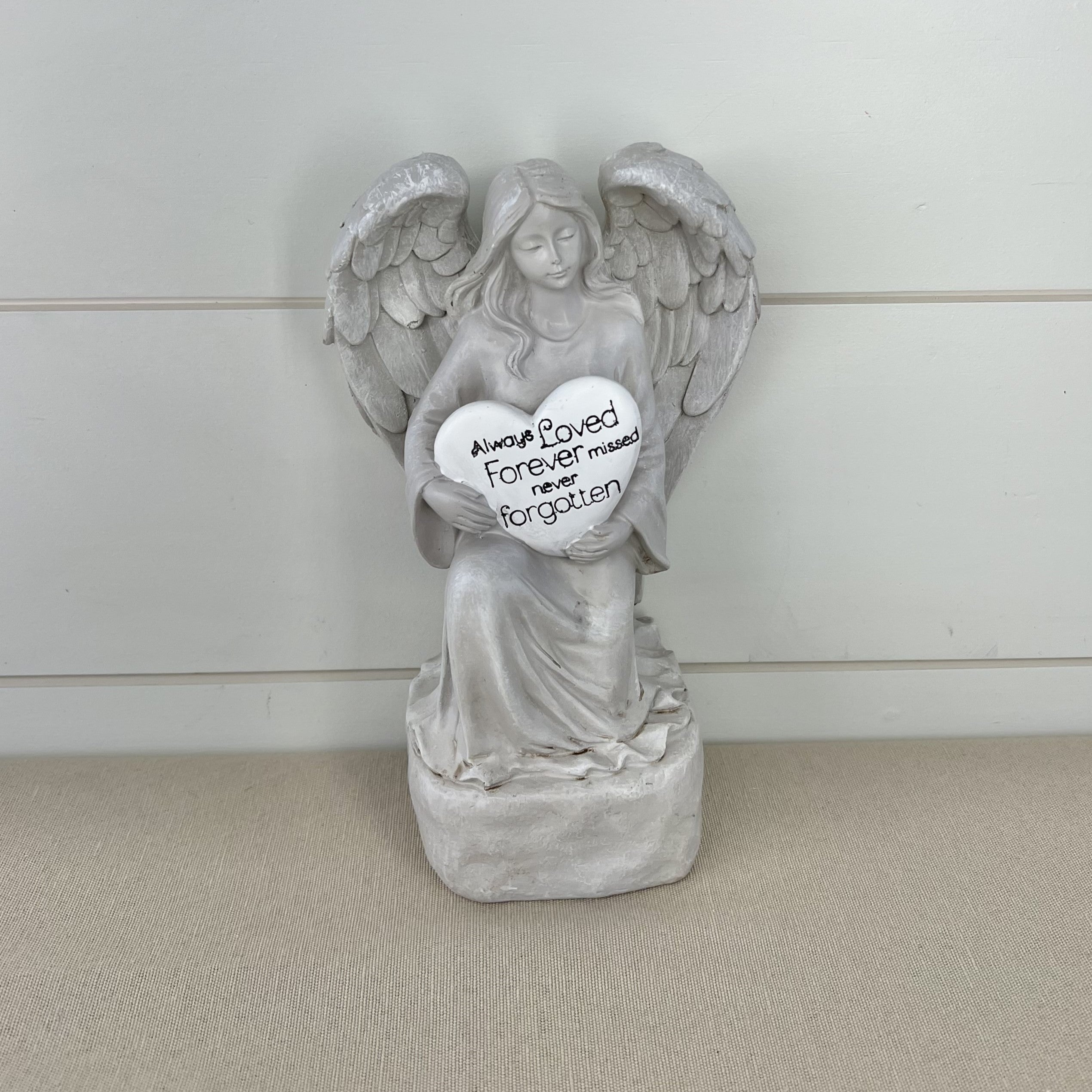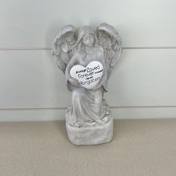 Resin grey & white angel holding a heart that says Always Loved Forever missed never forgotten