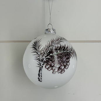 4 Inch Round White Glass Ornament w/Glittered Pine Sprig
