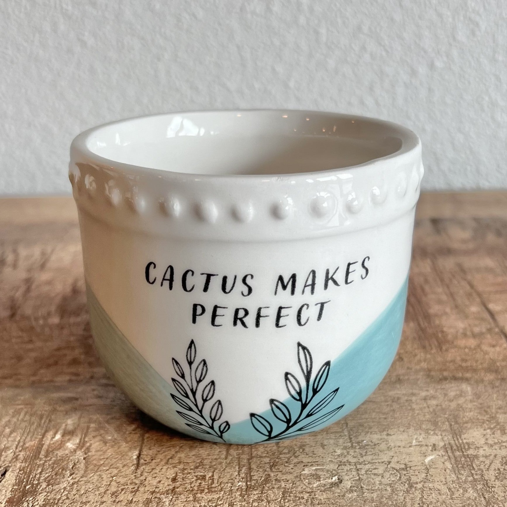 Ceramic White Planter with 2 toned blue bottom with little black plant doodle saying Cactus Makes Perfect