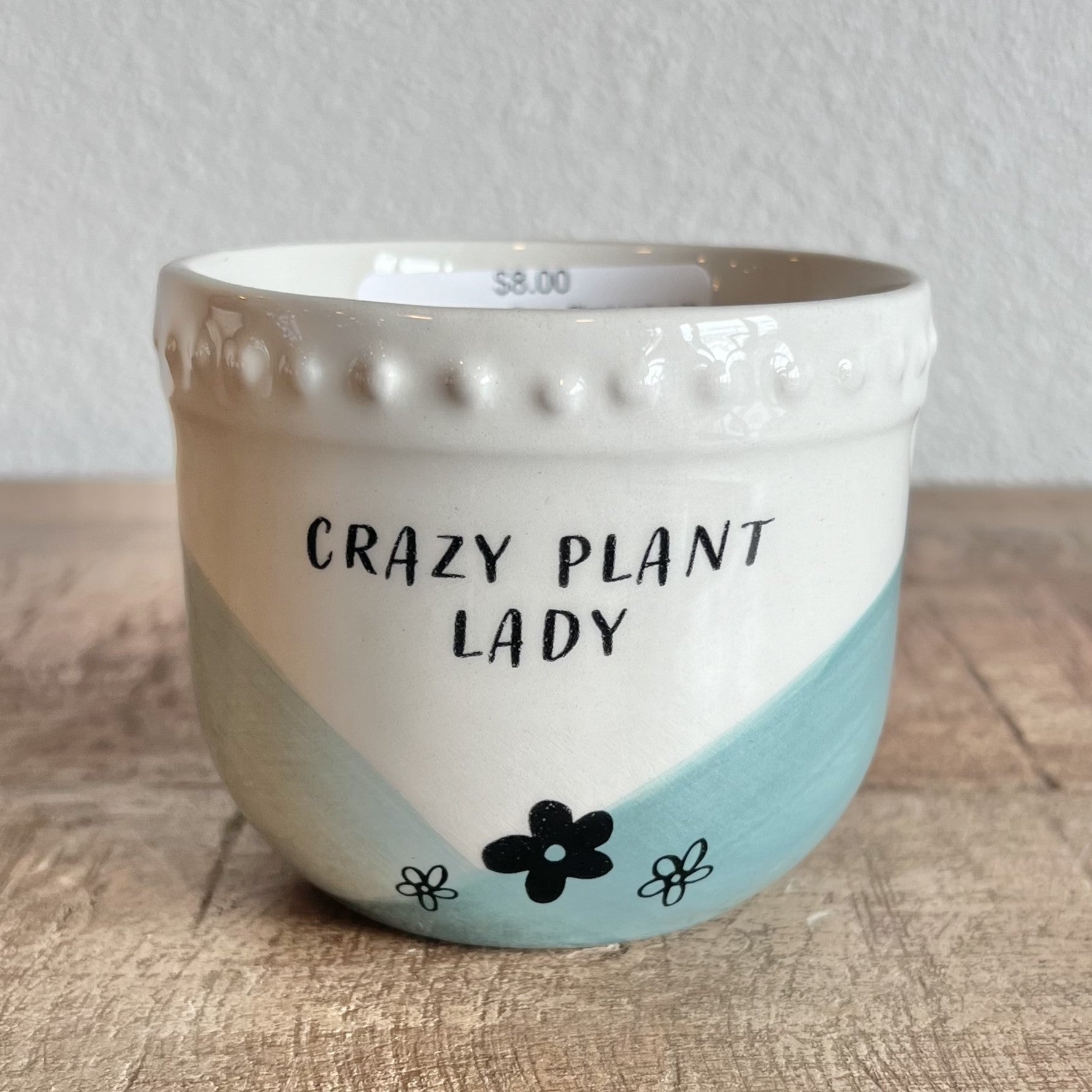 Ceramic White Planter with 2 toned blue bottom with little black plant doodle saying Crazy Plant Lady