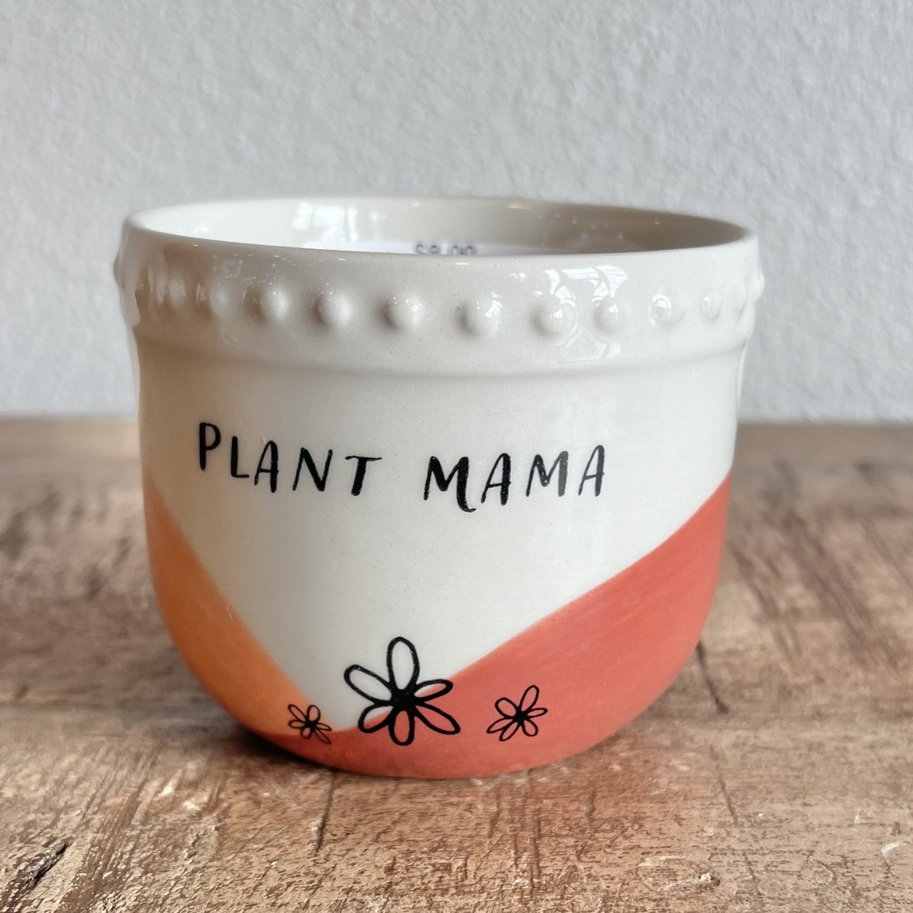Ceramic White Planter with 2 toned pink bottom with little black plant doodle saying Plant Mama