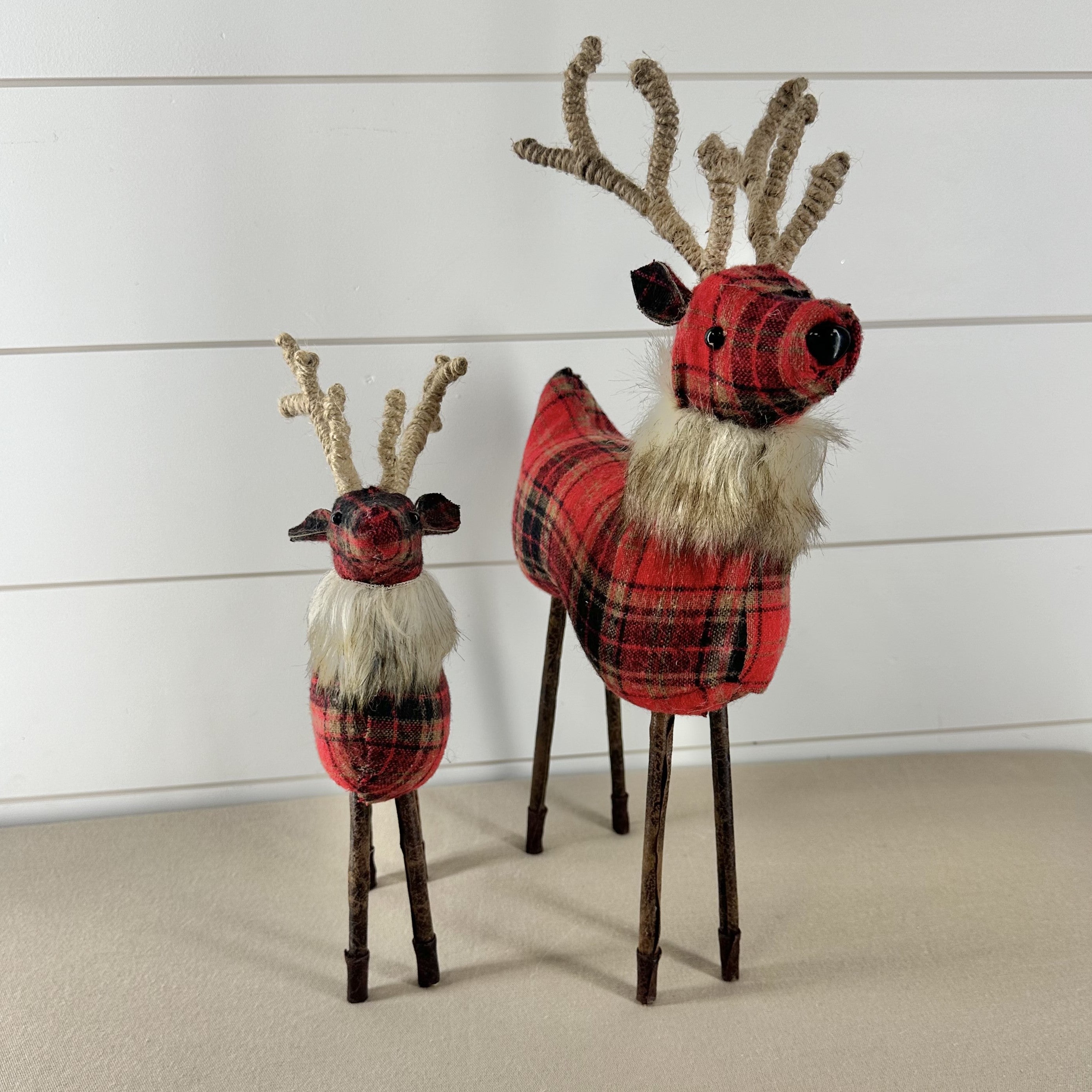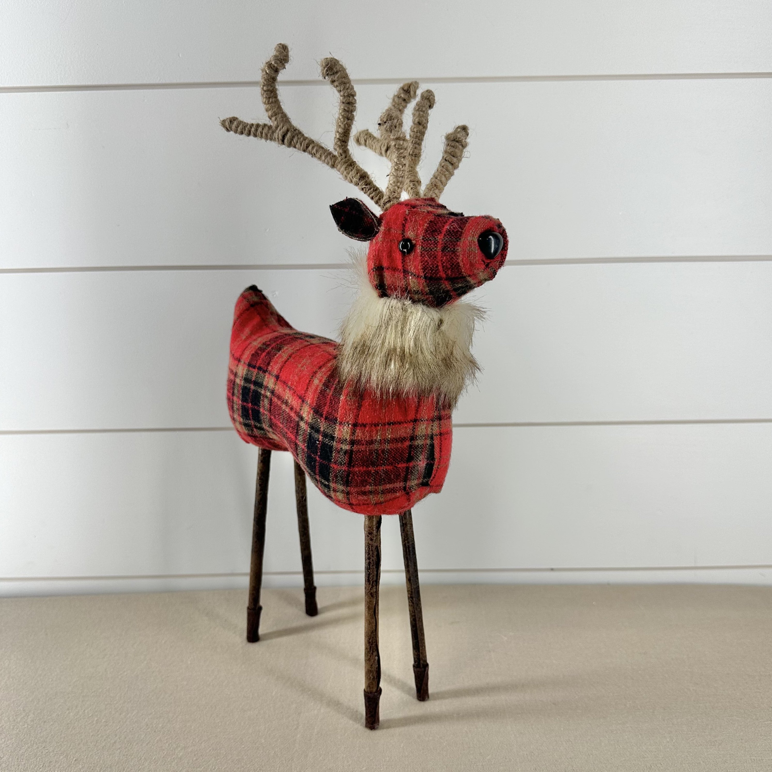 18.5 Inch Red Plaid Reindeer w/Twine Antlers and Fur Collar